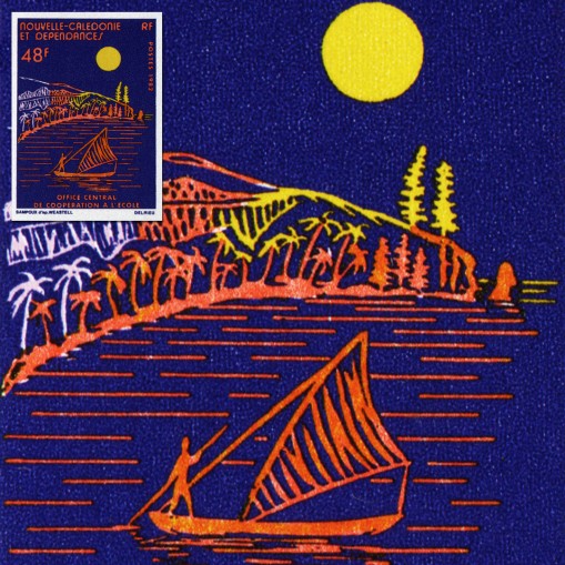 Na znaczku przedstawiono reprodukcję grafiki artysty o imieniu P. Weastell, przedstawiającej tradycyjną łódź kanu (canoe) w świetle księżyca.