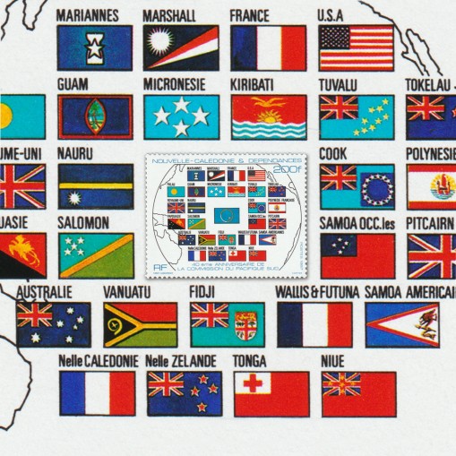 Znaczek wydany z okazji 40. rocznicy Komisji Południowego Pacyfiku, przedstawiający flagi wszystkich państw tej wspólnoty.