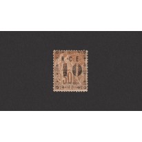 Znaczek francuski z emisji nazywanej „Commerce” („Handel”, współcześnie „Biznes”), drukowanej dla obszarów kolonialnych od 1881 roku, z przedrukiem nominału i nadrukiem „N.-C.E.” (Nouvelle-Calédonie).