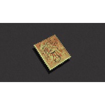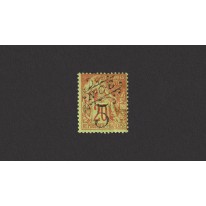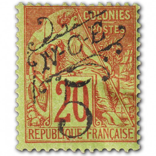 Znaczek francuski z emisji nazywanej „Commerce” („Handel”, współcześnie „Biznes”), drukowanej dla obszarów kolonialnych od 1881 roku, z przedrukiem nominału i nadrukiem „N-C-E” (Nouvelle-Calédonie).