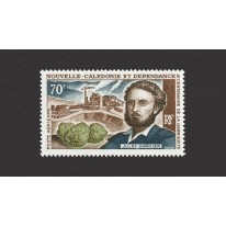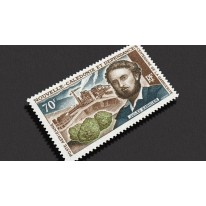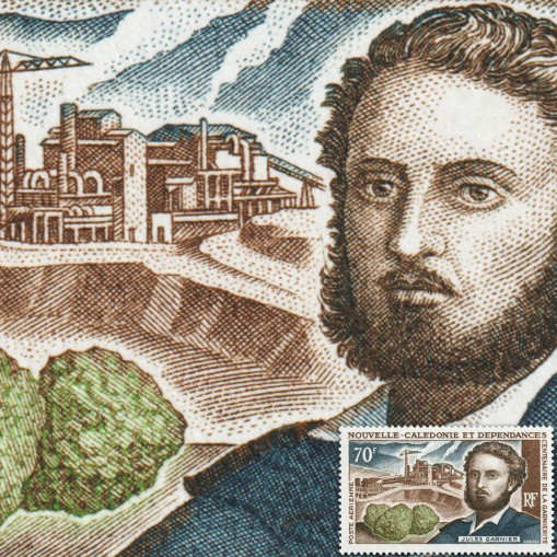 Na znaczku widnieje portret odkrywcy tego minerału, geologa Julesa Garniera, na tle kopalni.