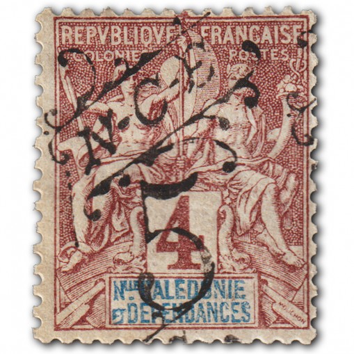 Znaczek francuski z emisji nazywanej „Nawigacja i Handel" („Nawigacja i Biznes"), drukowanej dla obszarów kolonialnych, z przedrukiem nominału i nadrukiem „N-C-E” (Nouvelle-Calédonie).