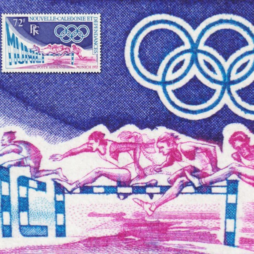 Na znaczku widnieją sportowcy w biegu przez płotki, skaczący ponad literą „H” słowa „MUNICH”.