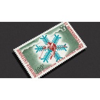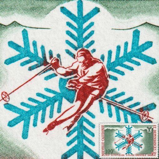 Znaczek upamiętniający zimowe igrzyska olimpijskie w Grenoble. Widnieje na nim narciarz na tle motywu śnieżynki i gór.