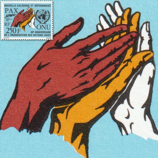 Znaczek wydany z okazji 40. rocznicy Organizacji Narodów Zjednoczonych, przedstawiający trzy ręce różnych ras, złożone obok symbolu pokoju oraz godła ONZ.