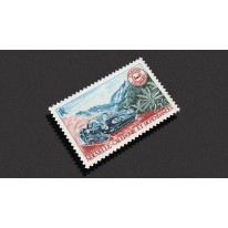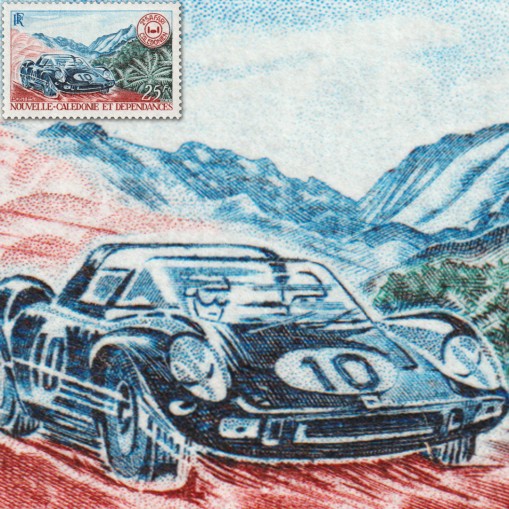 Znaczek upamiętniający drugie samochodowe safari w Nowej Kaledonii. Widnieje na nim samochód rajdowy.
