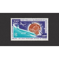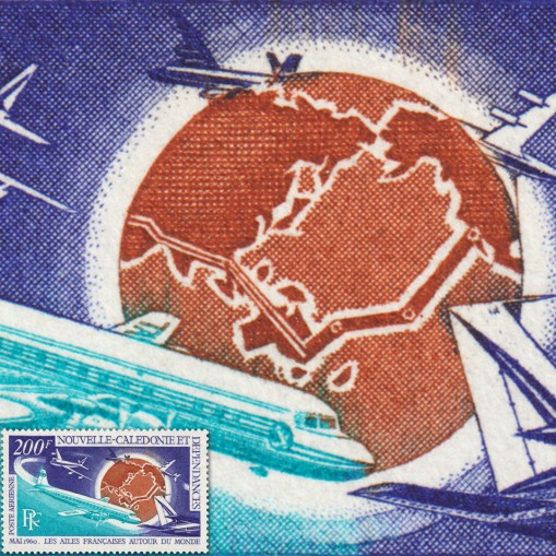 Znaczek upamiętniający 10. rocznicę francuskich lotów „dookoła świata”. Na znaczku widnieją samoloty Douglas DC-6B, Boeing 707 i inne, krążące wokół kuli ziemskiej.