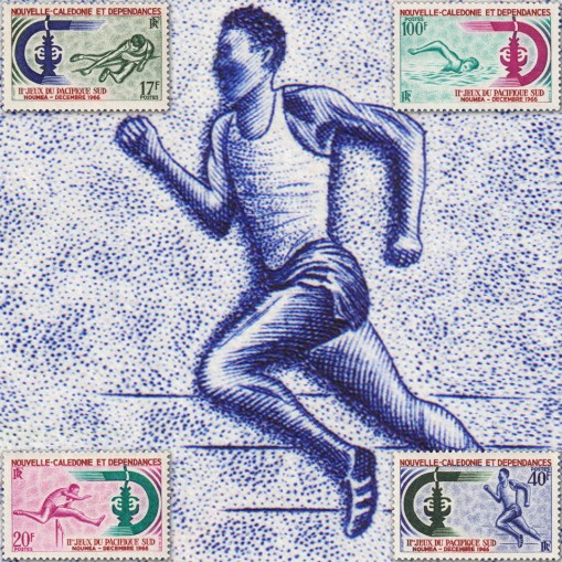 Znaczki promujące drugie Igrzyska Sportowe Południowego Pacyfiku odbywające się w Numei.