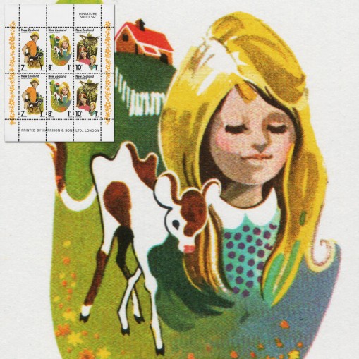 Na znaczkach widnieją dzieci z kucykiem, cielakiem i ptakiem.