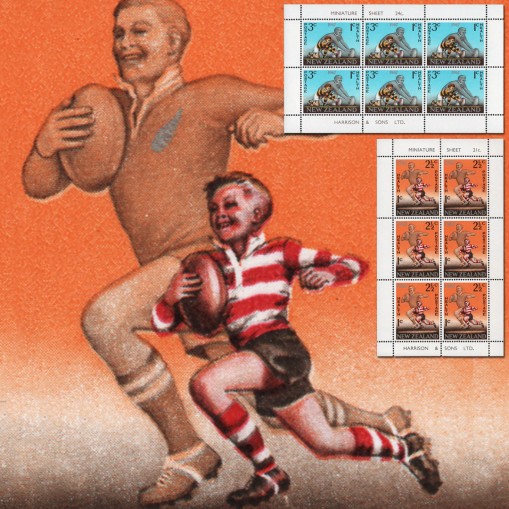 Na znaczkach widnieją dzieci grające w rugby i profesjonalni zawodnicy, jakimi mogą się one stać w przyszłości.