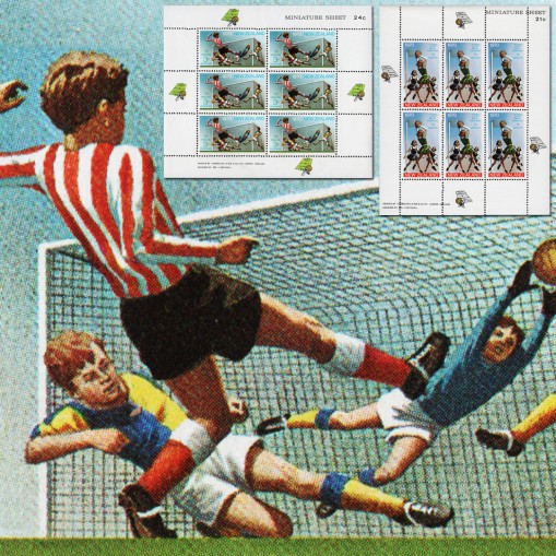 Na znaczkach widnieją dziewczynki grające w koszykówkę i chłopcy grający w piłkę nożną.