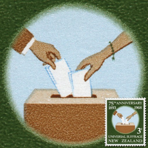Znaczek upamiętniający 75-lecie równych praw wyborczych kobiet i mężczyzn w Nowej Zelandii.