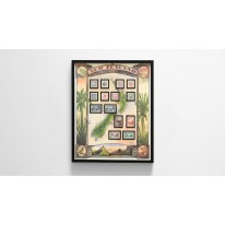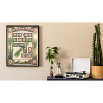 Elegancka, innowacyjna i niezmiernie efektowna wizualnie metoda prezentacji znaczków - kompletna seria wyeksponowana na planszy z ilustracją i oprawiona w ramę.