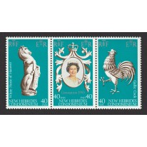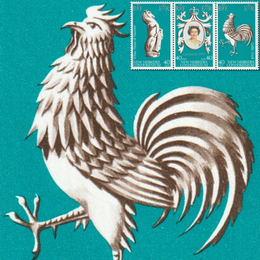 Na znaczkach widnieją kolejno: biały koń z herbu rodu Hanover (rzeźba ta jest jedną z dziesięciu figur heraldycznych reprezentujących genealogię Elżbiety II wykonanych na okazję koronacji monarchini), portret Elżbiety II oraz kogut galicyjski.