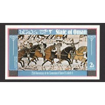 Na bloku widnieje fragment tkaniny z Bayeux, ręcznie haftowanego płótna przedstawiającego podbój Anglii przez Wilhelma I Zdobywcę i bitwę pod Hastings w 1066 roku.