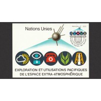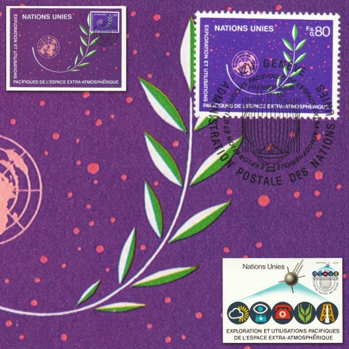 Na znaczkach i kartach widnieją: przestrzeń kosmiczna i gałązka wawrzynu oraz satelita i symbole obszarów, na które wpływ może mieć eksploracja kosmosu.