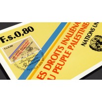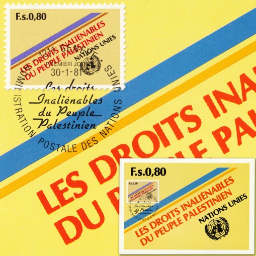 Znaczek zwracający uwagę na niezbywalne prawa ludności palestyńskiej do „samostanowienia, niepodległości narodowej i suwerenności, i powrotu na ich ziemie i do domów”.