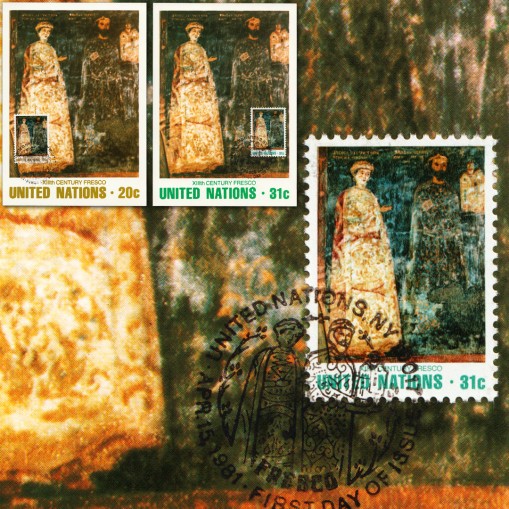 Na znaczkach i kartach widnieje dzieło sztuki bizantyjskiej z okresu średniowiecza - XIII-wieczny fresk z klasztoru w Bojanie niedaleko Sofii przedstawiający bułgarskiego sewastokratora Kałojana i jego żonę Desisławę.