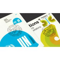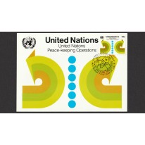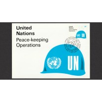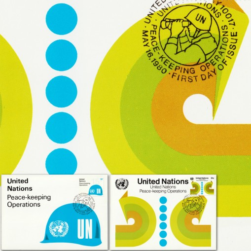 Na znaczkach i kartach widnieje hełm z logo ONZ i symboliczne przedstawienie zażegnania konfliktu.