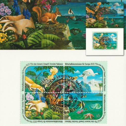 Znaczki w arkuszu na karcie maksimum promujące działania Europejskiej Komisji Gospodarczej na rzecz poprawy stanu środowiska naturalnego.