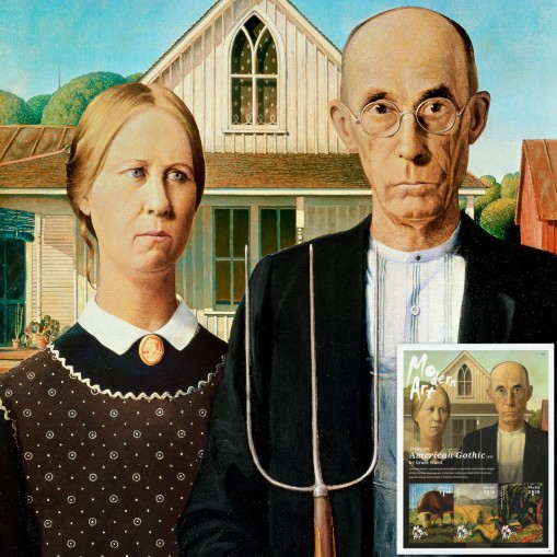 Na znaczkach i bloku widnieją następujące obrazy amerykańskich (za wyjątkiem Rivery) artystów z pierwszej połowy XX wieku: