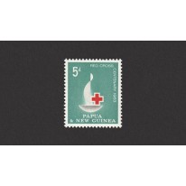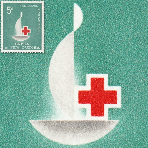 Znaczek upamiętniający stulecie Czerwonego Krzyża. Na znaczku widnieje logo tych obchodów: znicz i czerwony krzyż.