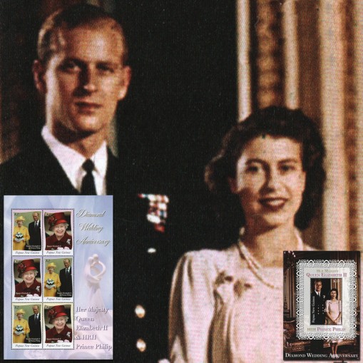 Seria w arkuszu i blok upamiętniająca 60. rocznicę ślubu królowej Elżbiety II i księcia Filipa.