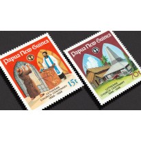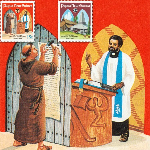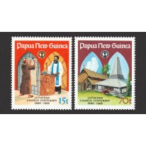 Znaczki upamiętniające stulecie istnienia kościoła luterańskiego na wyspach Papui-Nowej Gwinei.