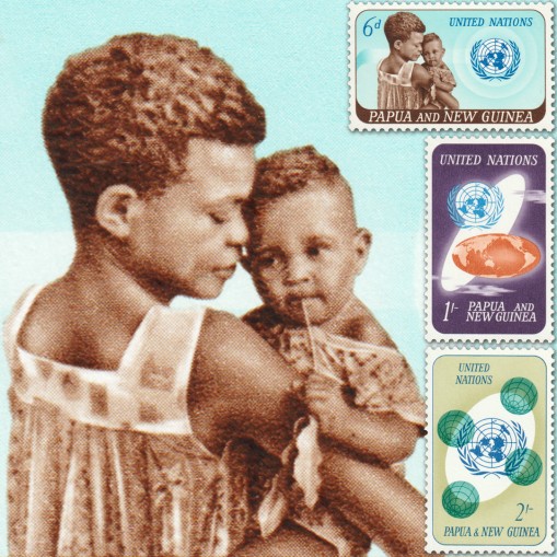 Na znaczkach widnieją: matka z dzieckiem, kula ziemska i logo ONZ.