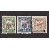 Znaczki zostały urzędowo przedziurkowane oraz umieszczono na nich nadruk „SPECIMEN", czyli przygotowano je do wykorzystania jako wzorce dla urzędników peruwiańskich, którzy mogli w ten sposób porównać znaczek na dokumencie z oryginałem. Było to istotnym, ponieważ oryginalne znaczki były używane, gdy trzeba było pobierać różne narodowe podatki skarbowe lub opłaty urzędowe (stąd napis „COMPAÑIA RECAUDADORA DE IMPUESTOS" na znaczkach - Firma Inkasująca Podatki, czyli po prostu Urząd Skarbowy).