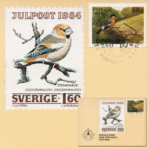 Na znaczku widnieje gil azorski, narażony na wyginięcie gatunek ptaka z rodziny łuszczakowatych. Na karcie zaś przedstawiono walor szwedzki przedstawiający ptaka grubodzioba.
