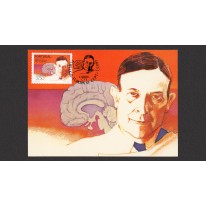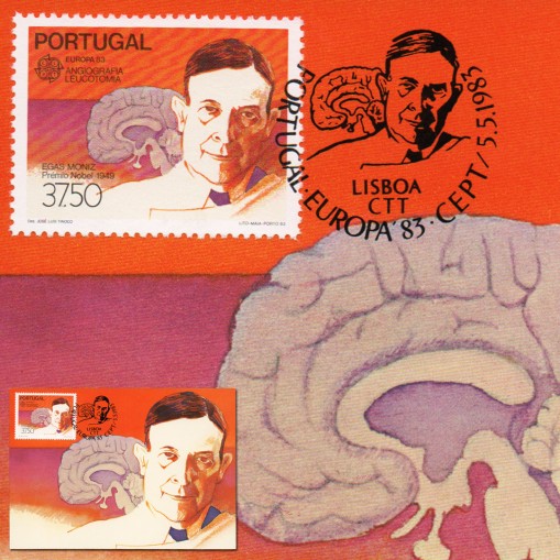 Na znaczku przedstawiono Egasa Moniza, neurologa, chirurga i laureata nagrody Nobla w 1949 „za odkrycie terapeutycznej wartości lobotomii w pewnych psychozach”.