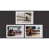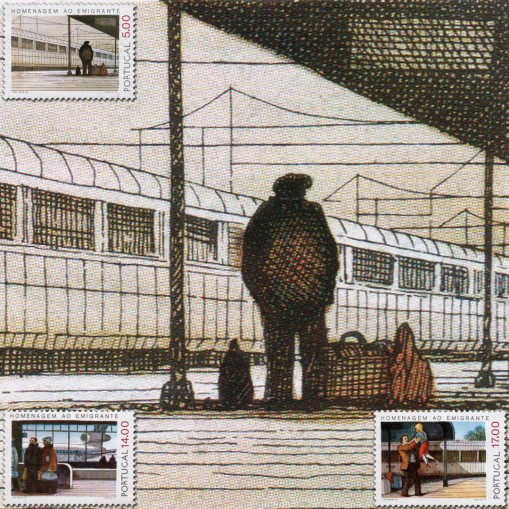 Na znaczkach widnieją ludzie na dworcu kolejowym, na lotnisku oraz mężczyzna witający dziecko na peronie kolejowym.