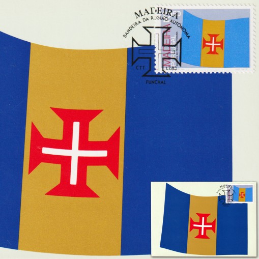 Znaczek na karcie maksimum, na którym widnieje flaga Regionu Autonomicznego Madery.