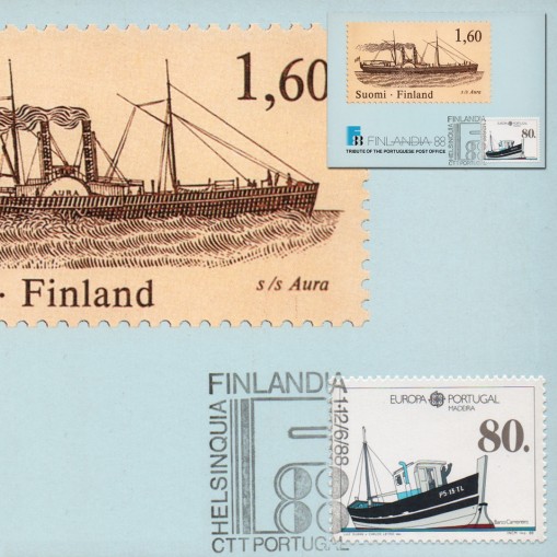 Znaczek z emisji EUROPA CEPT z 1988 roku na karcie maksimum promującej pocztę maderską na międzynarodowej wystawie filatelistycznej „Finlandia’88” w Helsinkach.