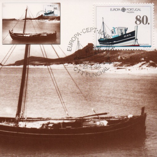 Znaczek z emisji EUROPA CEPT z 1988 roku na karcie maksimum. Tematem przewodnim tej emisji była historia poczty i telekomunikacji.