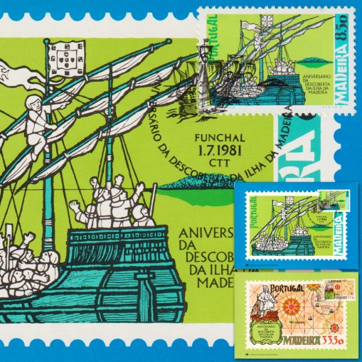 Znaczki na kartach maksimum upamiętniające 560. rocznicę odkrycia wyspy Madera.