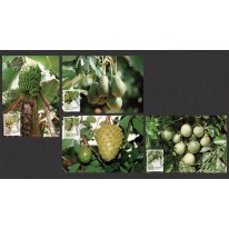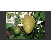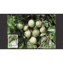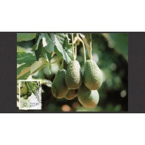 Znaczki na kartach maksimum, na których widnieją owoce regionów subtropikalnych: banany, awokado, flaszowiec peruwiański (cherymoja) i męczennica jadalna (marakuja).