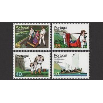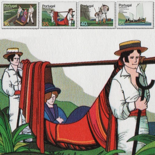 Seria ukazująca tradycyjne środki transportu na Maderze, kolejno: sanie, palankin, mężczyzn niosących winogrona zwanych borracheiros oraz tradycyjną łódź żaglową zwaną carreira.