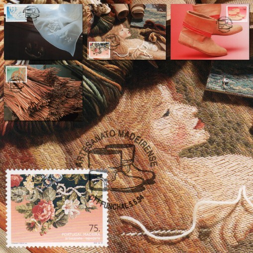 Seria na kartach maksimum, na znaczkach której widnieją przykłady tradycyjnego rzemiosła maderskiego: haft angielski, gobelin, buty z Camacha i plecione oparcie krzesła.