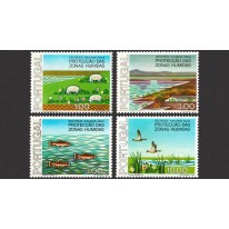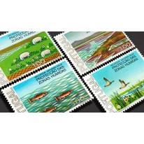 Na znaczkach widnieją pasące się owce, krajobraz bagienny, pstrągi i lecące kaczki krzyżówki.