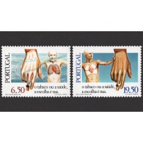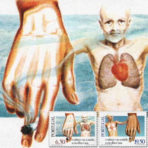 Na znaczkach widnią dłonie z, kolejno, zapalonym i zgaszonym papierosem i, odpowiednio, człowiek z chorymi i zdrowymi płucami.