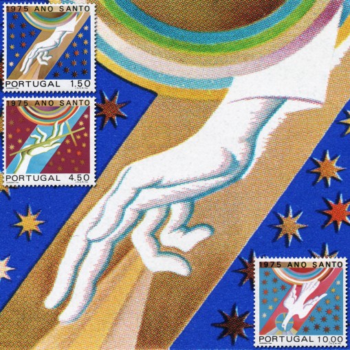 Na znaczkach widnieją kolejno: ręka boża, dłoń z krzyżem i duch święty w postaci gołąbka.