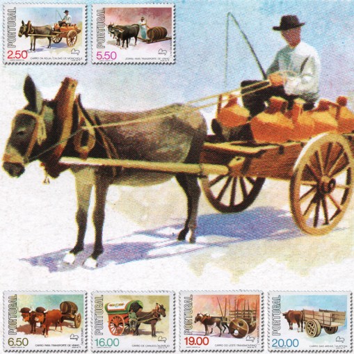 Na znaczkach widnieją tradycyjne portugalskie wozy i zaprzęgi, kolejno: