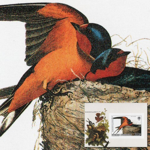 Znaczek w bloku upamiętniający dwusetną rocznicę urodzin Johna Jamesa Audubona, amerykańskiego ornitologa, przyrodnika i malarza.