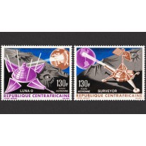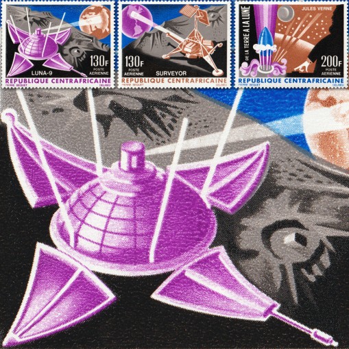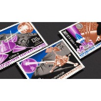 Znaczki upamiętniające amerykańskie i radzieckie misje kosmiczne mające na celu lądowanie na Księżycu.