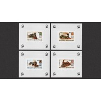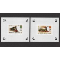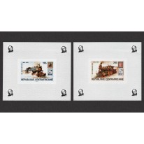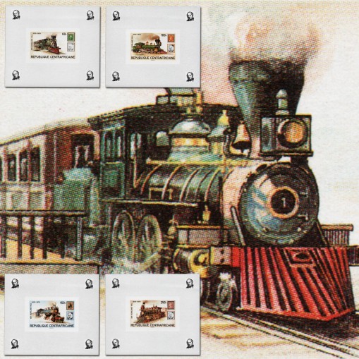 Na znaczkach widnieją wczesne znaczki i lokomotywy parowe.