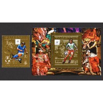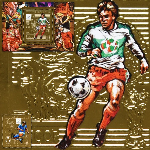 Na znaczkach i bloku widnieją piłkarze na tle, kolejno, portretu Leonarda da Vinci i rzeźby Michała Anioła przedstawiającej Mojżesza.