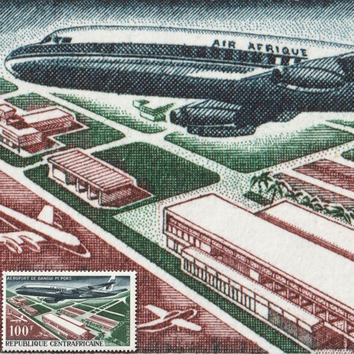 Na znaczku widnieje samolot Douglas DC-8 ponad lotniskiem M-Poko w Bangi, stolicy Republiki Środkowoafrykańskiej.