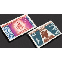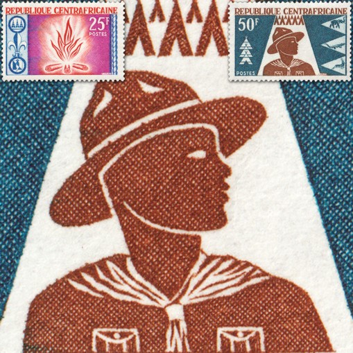 Na znaczkach widnieje skaut oraz ognisko.
